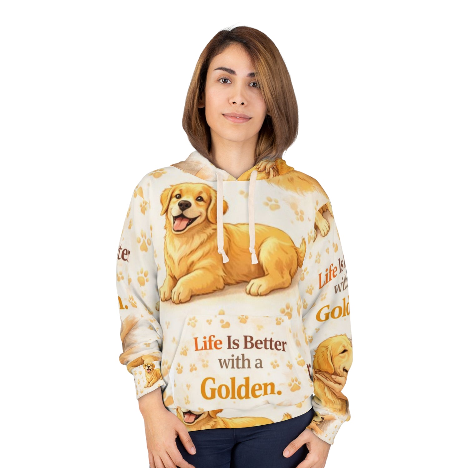 Designed for everyday comfort and endless Golden Retriever chaos, this premium all-over print hoodie wraps you in warmth while celebrating the joy, love, and personality that make Goldens unforgettable.